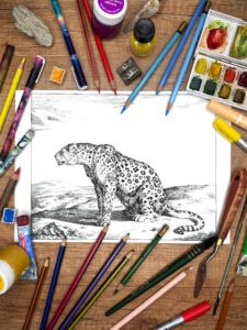 Biało-czarny wydruk laserowy do kolorowania, format A4, papier 300 g/m², gładki (prasowany na gorąco) – idealny do pracy z większością przyborów rysunkowych i malarskich.