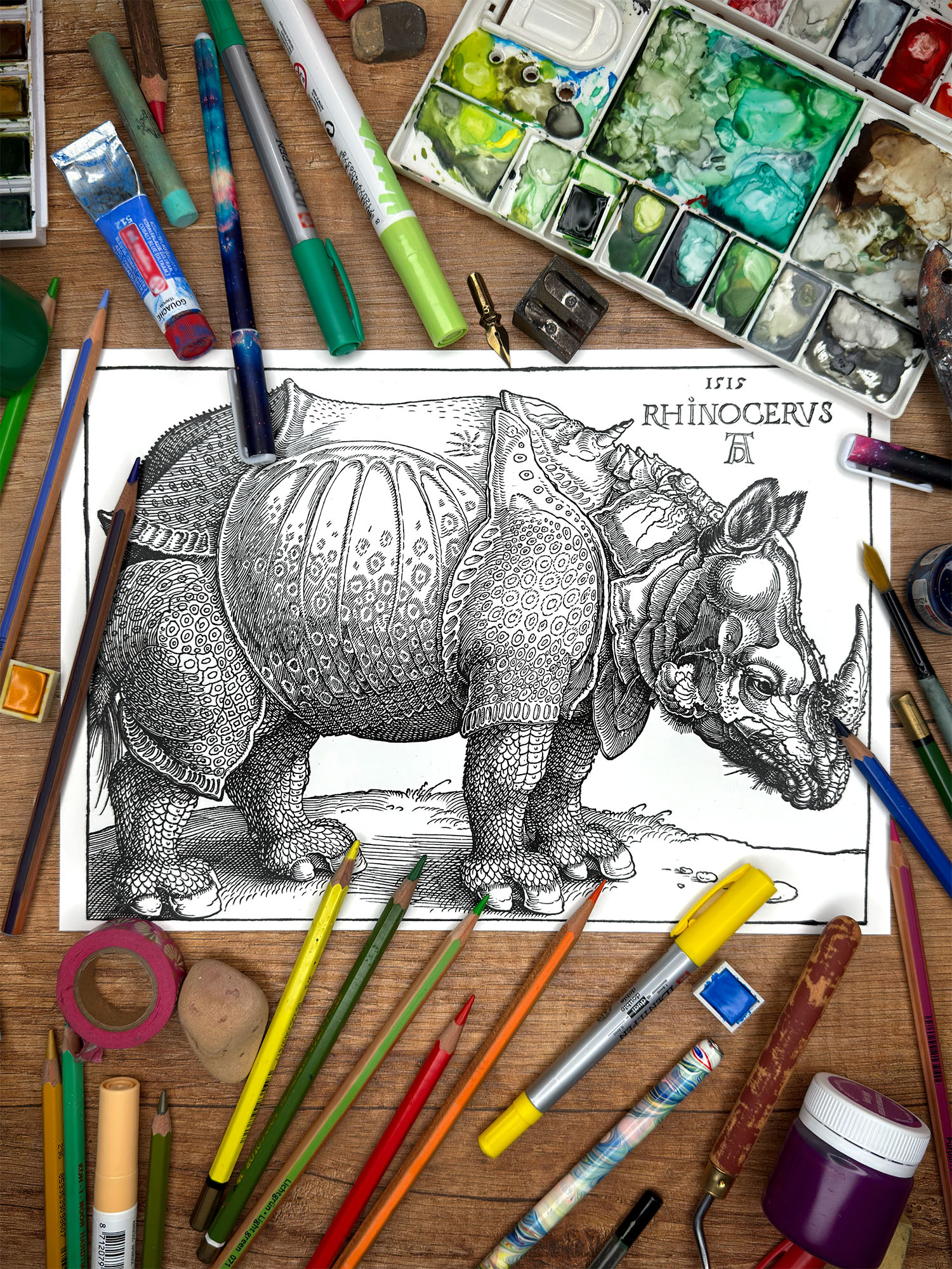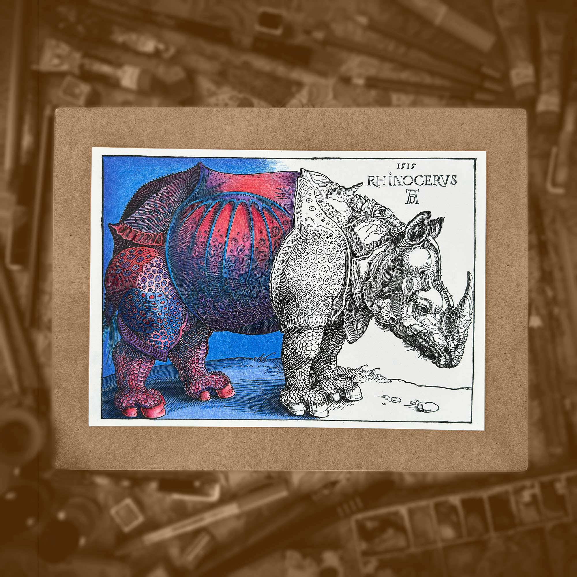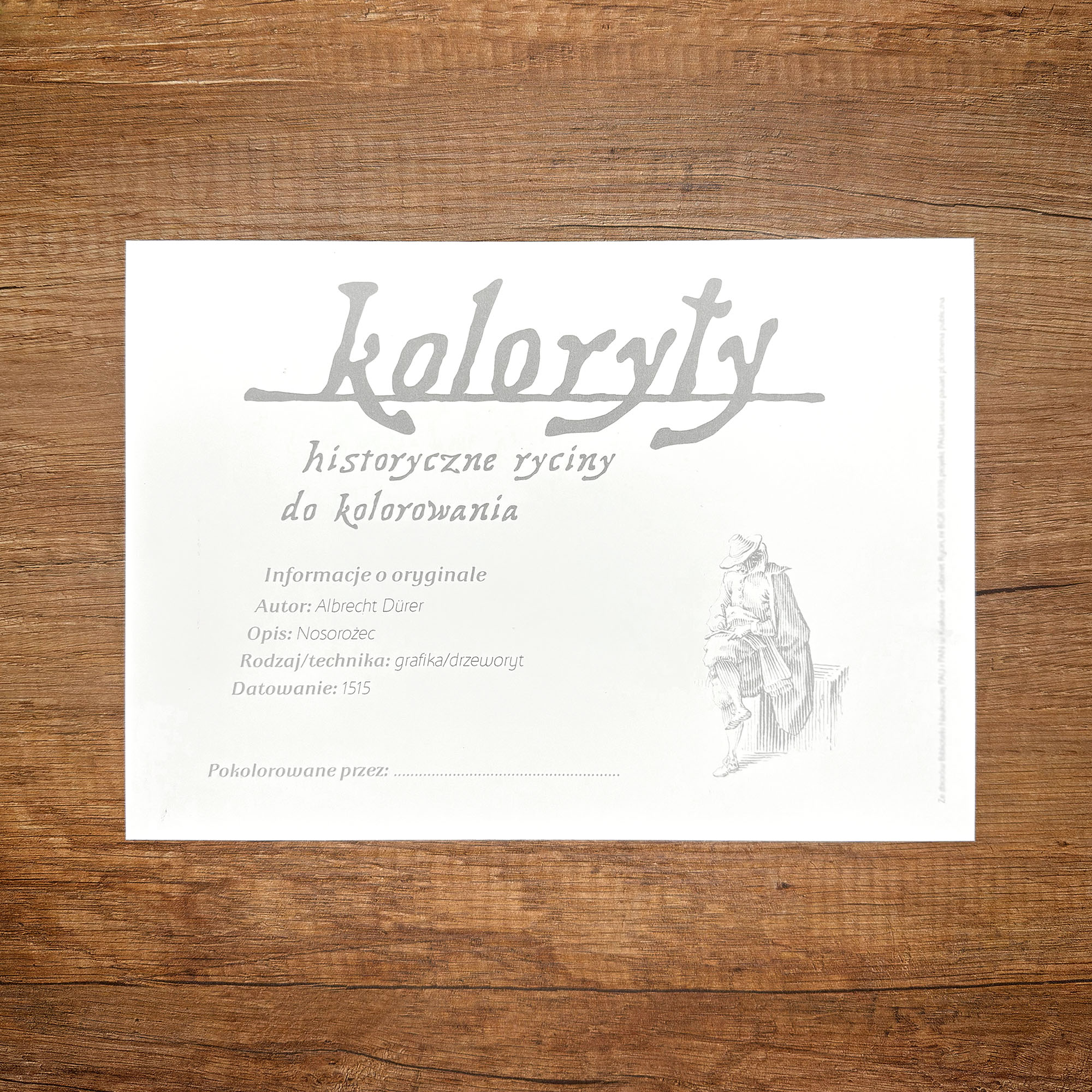 Autorem tej niezwykłej grafiki jest Albrecht Dürer – renesansowy mistrz, którego prace do dziś zachwycają precyzją i wyobraźnią. „Nosorożec” powstał w 1515 roku w technice drzeworytu i stał się jedną z najsłynniejszych ilustracji zwierzęcia, którego sam Dürer nigdy nie widział na żywo. Stworzył ten wizerunek na podstawie opisu i szkicu, nadając mu fantazyjny, niemal mityczny charakter – zbrojny pancerz, mocna sylwetka i dekoracyjne detale sprawiają, że nosorożec ten do dziś działa na wyobraźnię.