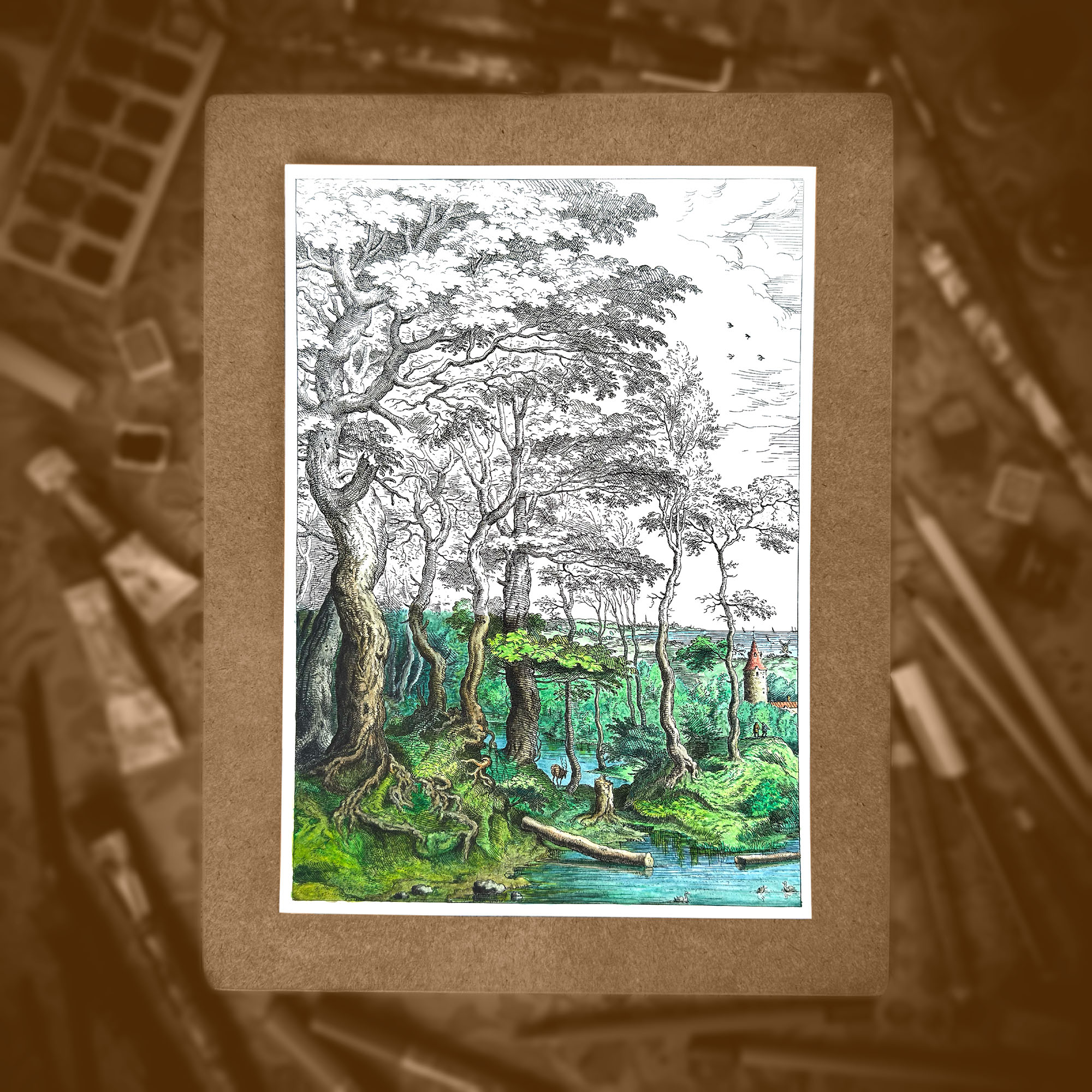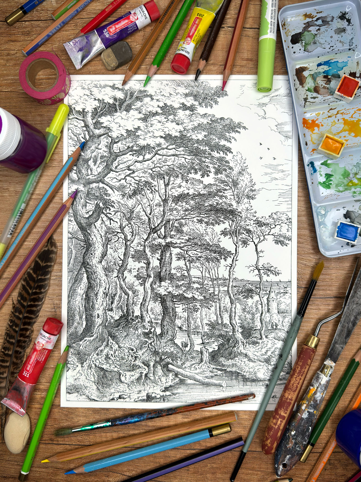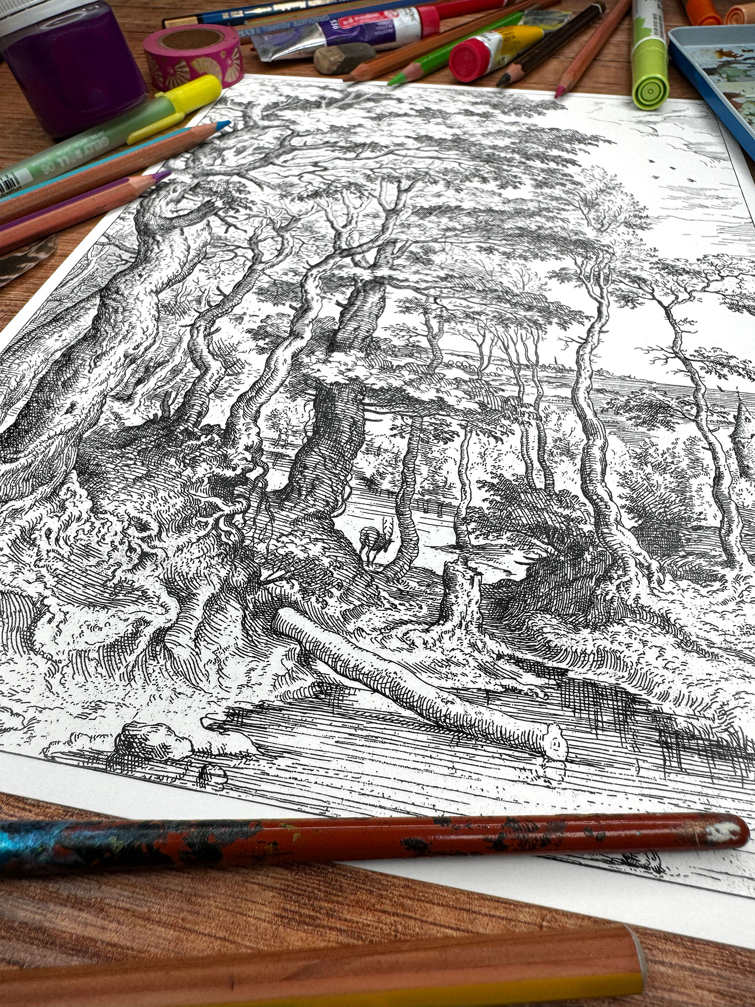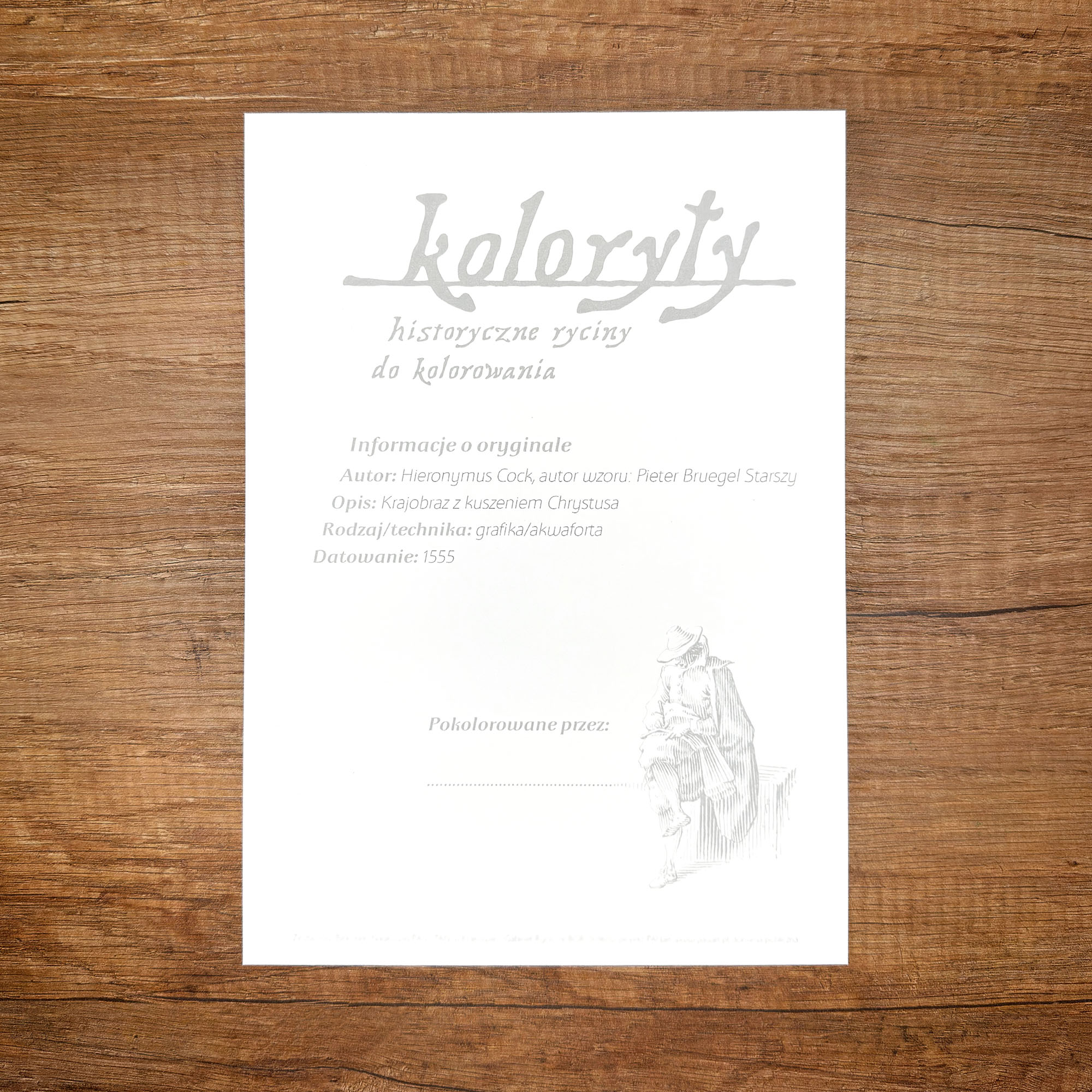 Prezentowany fragment przedstawia gęsty, stary las – przestrzeń tajemniczą, pełną życia i głębi, typową dla pejzażowej wrażliwości Bruegla. Z całej ryciny świadomie wybraliśmy właśnie ten motyw i wykadrowaliśmy go, by wydobyć jego wyjątkowy klimat i strukturę. Reprodukcja została następnie starannie wyczyszczona i przygotowana specjalnie z myślą o kolorowaniu. Dzięki temu każdy detal jest czytelny i gotowy na Twoją indywidualną interpretację.