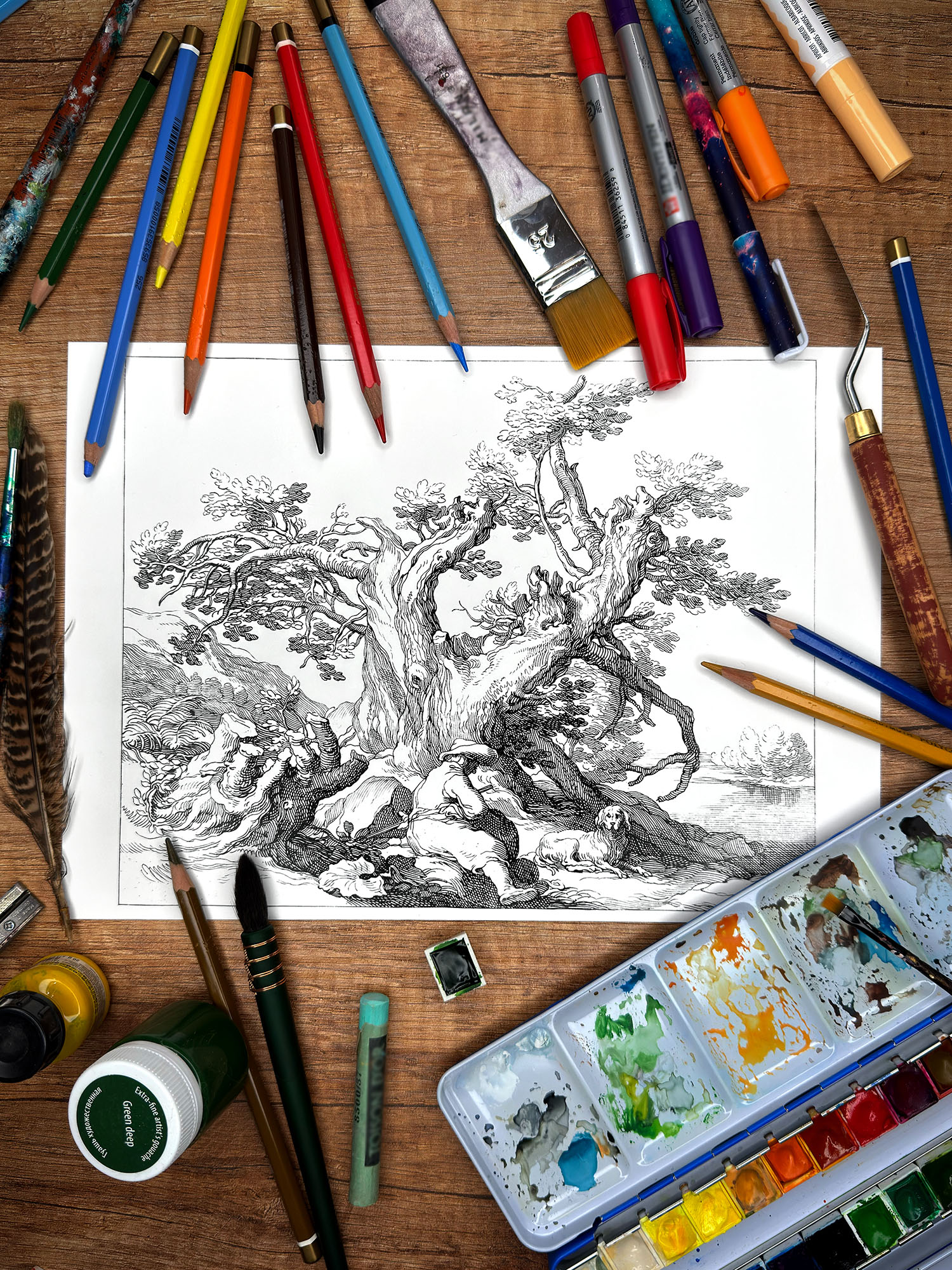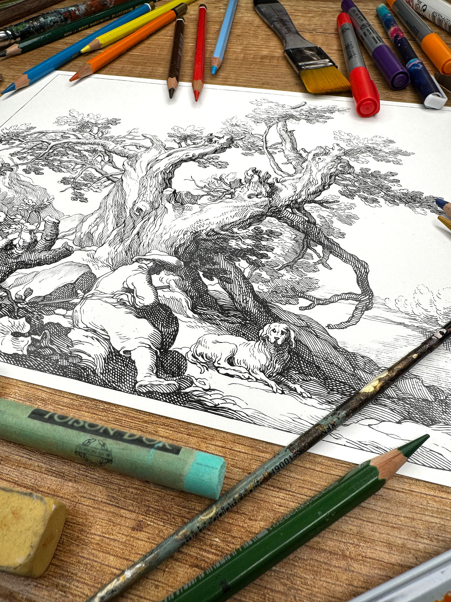 Aby umożliwić współczesne, twórcze podejście do tego barokowego dzieła, przygotowaliśmy jego reprodukcję w wersji przeznaczonej do kolorowania. Starannie ją wyretuszowaliśmy, usuwając ślady upływu czasu i wzmacniając linie tak, by każdy element kompozycji pozostał wyraźny i gotowy do pracy twórczej. Dzięki temu możesz z łatwością nadać własny rytm i charakter tej nastrojowej scenie.