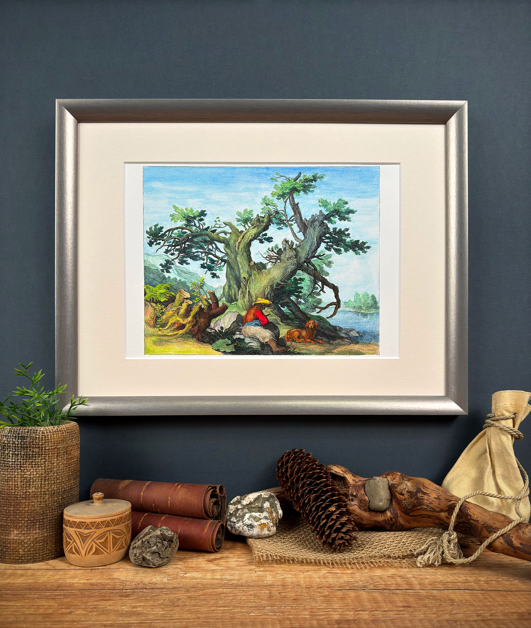 Grafikę wykonał Frederik Bloemaert według wzoru autorstwa swojego ojca, Abrahama Bloemaerta – jednego z najwybitniejszych przedstawicieli niderlandzkiego baroku. Powstała około 1635 roku w technice akwaforty i ukazuje monumentalne, stare drzewo wyrastające ponad wiejski krajobraz. Na pierwszym planie widoczny jest wieśniak, zatrzymujący się przy pniu wraz ze swoim psem, co nadaje scenie kameralny i ludzki wymiar. To piękny przykład graficznej harmonii między naturą a codziennością, z dbałością o detal i światłocień charakterystyczną dla Bloemaertów.