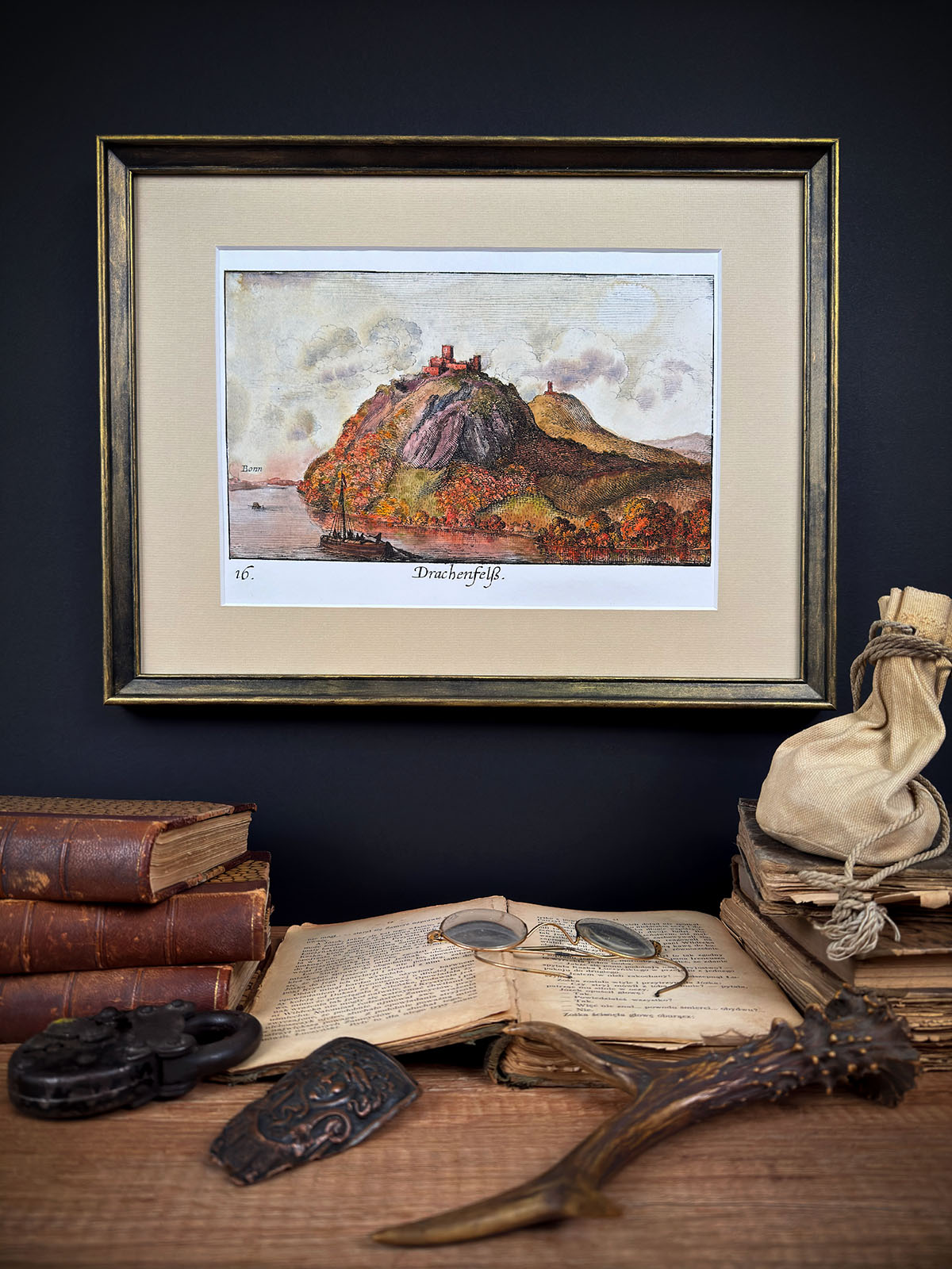 Autorem tej ryciny jest Václav Hollar – wybitny grafik XVII wieku, ceniony za wyjątkową precyzję i wrażliwość w ukazywaniu architektury oraz pejzaży. Grafika powstała około 1635 roku w technice akwaforty i przedstawia majestatyczny widok zamku Drachenfels, górującego nad doliną Renu. Kamienna twierdza, osadzona na skalistym wzgórzu, została ukazana z dbałością o każdy detal – od struktury murów po naturalne ukształtowanie terenu i rozciągający się w tle krajobraz. To nie tylko dokument topograficzny, ale i artystyczna interpretacja miejsca owianego legendą.